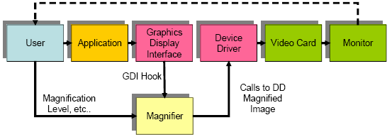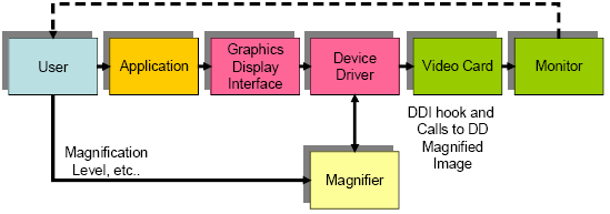 Fig. 4: Schematic of a Screen Magnifier using GDI hooking. The figure assumes that the magnified image is created by using the DD – this may not be the case.