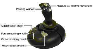 There are several reasons for testing a joystick as an input device to the screen magnifier. A mouse, the most commonly used input device for a screen magnifier, is a relative positioning device; hence its position cannot be used as a spatial reference. The magnifier can use a joystick as an absolute positioning device so that its movement corresponds directly to the location of the magnified image within the original image (called the absolute positioning mode). That is, to view the bottom right corner of the document, the joystick is tilted toward the user and to the right. The joystick also offers additional benefits, i.e. the buttons can be used to control the operation of the magnifier (see Fig.9 and 10). The magnifier can also treat the joystick as a relative positioning device, where a displacement of the joystick from its centre position causes the magnifier to move its focus in the corresponding direction. The image will continue to move in the direction of the displacement until the joystick is again centred, the edge of the screen is met, or the joystick is moved to indicate a new direction of travel. To maintain the magnified image as the same portion of the original image the user must move the joystick back to the centre position. This contrasts with the absolute positioning mode, where the user keeps the joystick in a particular position and the focus rests at the location indicated by that position.